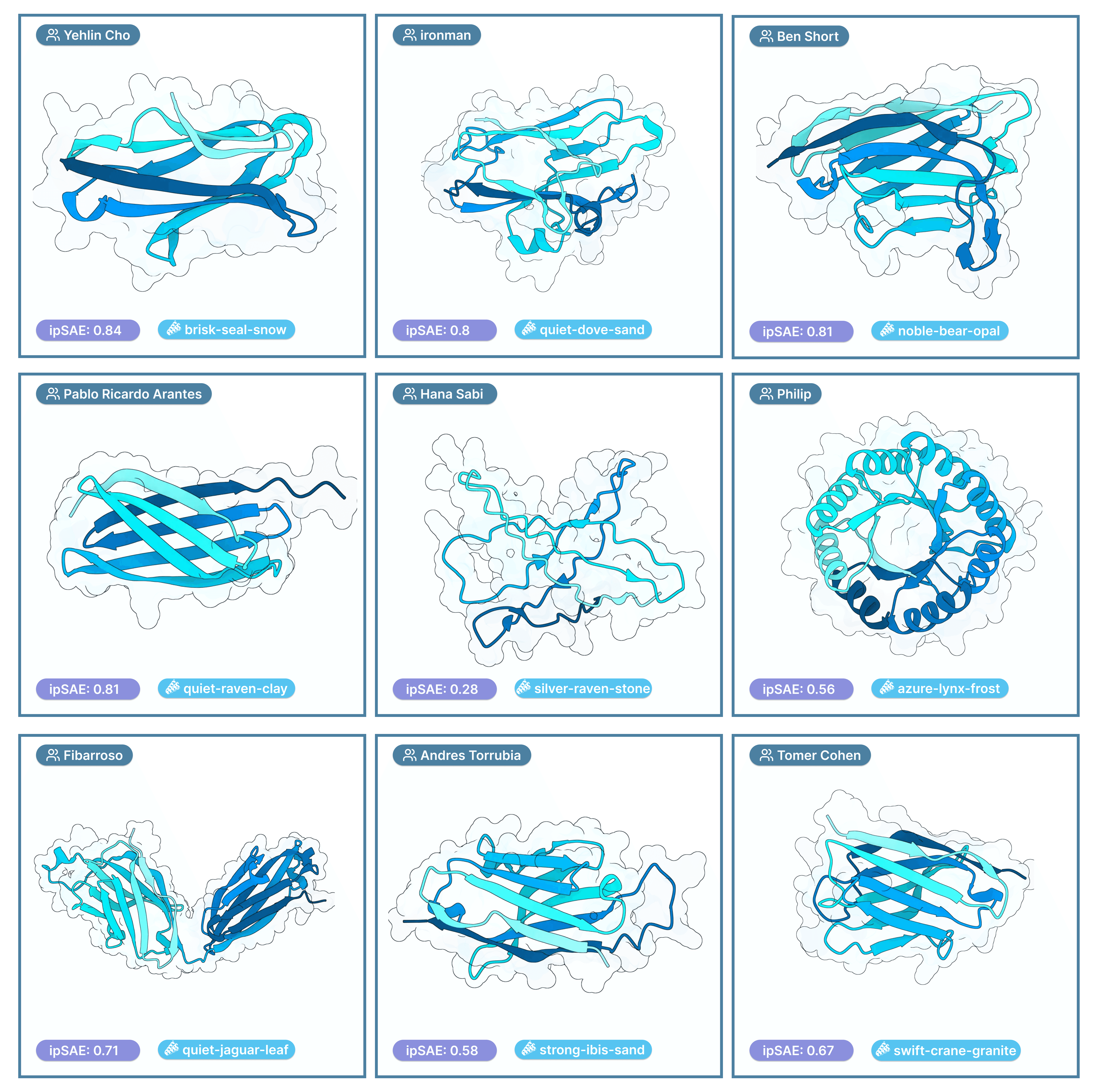Given the difficulty of choosing a universally robust scoring function, we wanted to complement the computational filtering with community input and expert knowledge when deciding which designs would ultimately be selected for experimental testing. We’d like to sincerely thank the community for enthusiastically participating in the community vote, championing their favorite designs, and generally making this process far more interesting than a simple ranking table. We also owe a big thank-you to a group of protein design experts who volunteered to dive into the submissions and hand-pick proteins they found particularly promising.