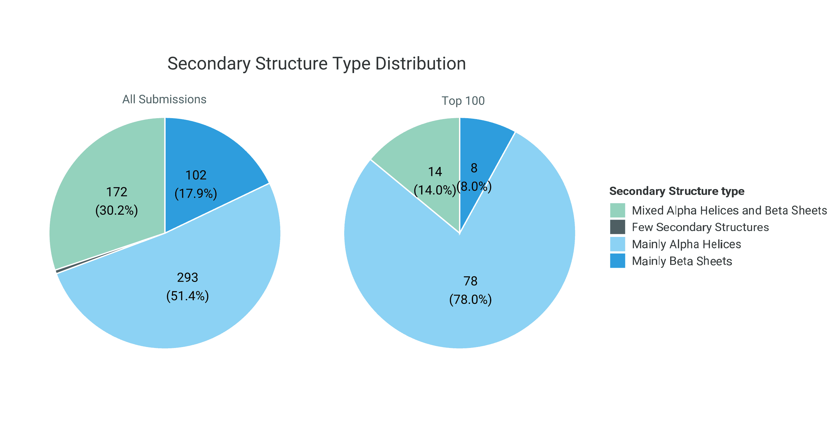 Interestingly, the top 100 designs are enriched for proteins dominated by α-helical structures compared to the full set of submissions. Correspondingly, designs containing mixed α-helical and β-sheet architectures, as well as predominantly β-sheet structures, are underrepresented among the top-ranked entries. This shift may reflect the greater fold stability and lower structural ambiguity of α-helical proteins, which can lead to more confident structure predictions and higher ipSAE scores.