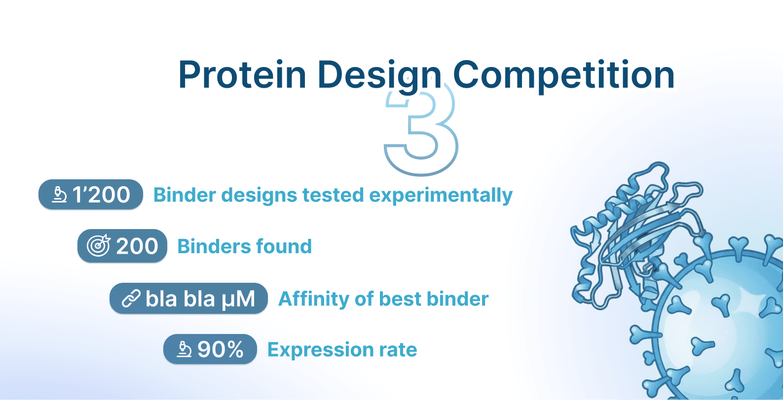 We’d go as far as to claim that binding has been solved. More than 4 years ago, it was rather difficult to get any de novo binder against a target: for example, the Baker lab paper that motivated our first EGFR competition reached a hit-rate of 0.01%. Now we can report an 8% hit-rate on an unconventional viral target, which doesn’t have too many solved complexes in databases like the PDB, in a contest where people used a wide variety of methods and did not always pick the most effective. Our hit-rate implies that in a single 96-well plate you’re bound to find at least 7-10 binders, thus lowering the need for high-throughput screening in library/display-based platforms.